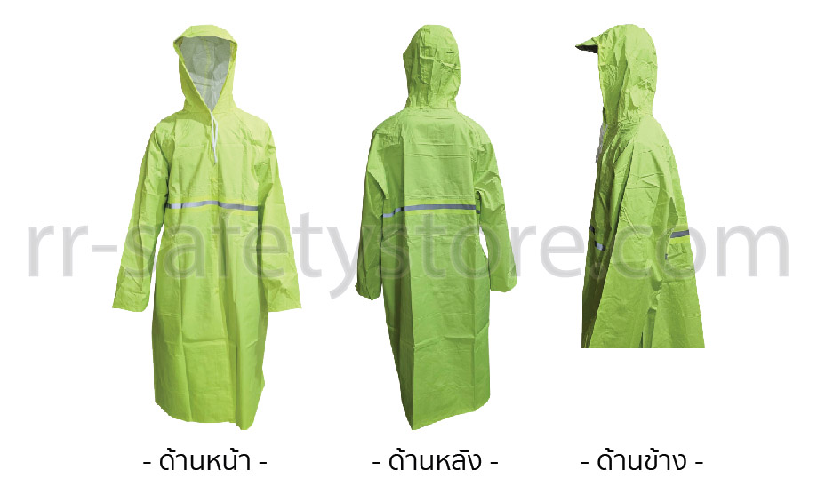 - มีแถบสะท้อนแสง 2 แถบ ด้านหน้าและด้านหลังเสื้อคลุมกันฝน